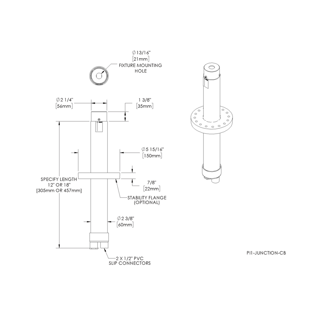 Installation: Stability Flange included., 2” Schedule 80 PVC pipe. For direct burial in soil or concrete. Includes two (2) 1/2” PVC slip connectors for branch circuit wiring.