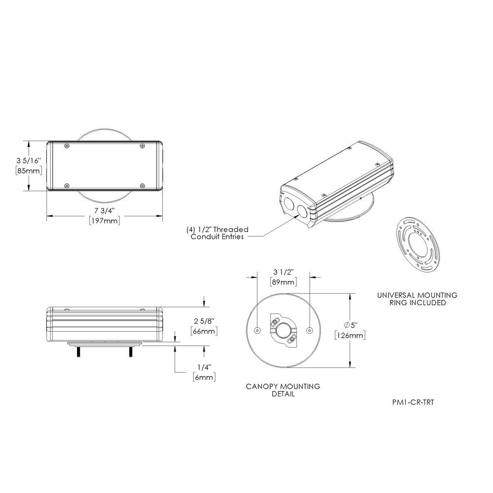 Installation: 5” dia., machined canopy. Stainless steel universal mounting ring for use with 4” octagonal junction box. Camlock provides additional 30° adjustment for precision alignment of UPM regardless of junction box orientation.