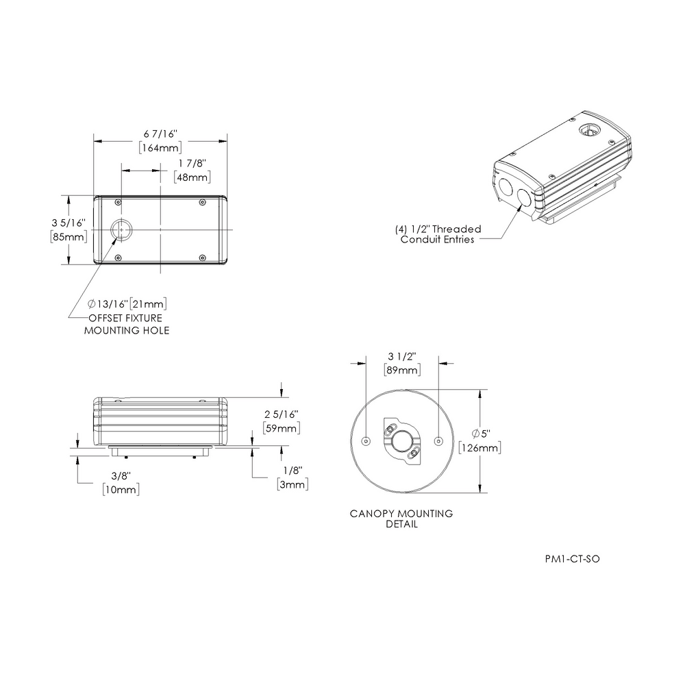 Installation: 5” x 3" canopy. For use with single gang junction box. Integral Camlock provides additional 30° adjustment for precision alignment of UPM regardless of junction box orientation.