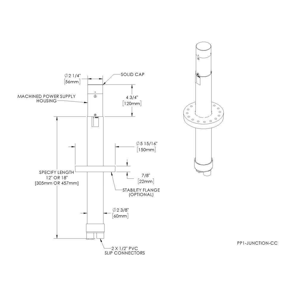 Installation: Stability Flange included., 2” Schedule 80 PVC pipe. For direct burial in soil or concrete. Includes two (2) 1/2” PVC slip connectors for branch circuit wiring.